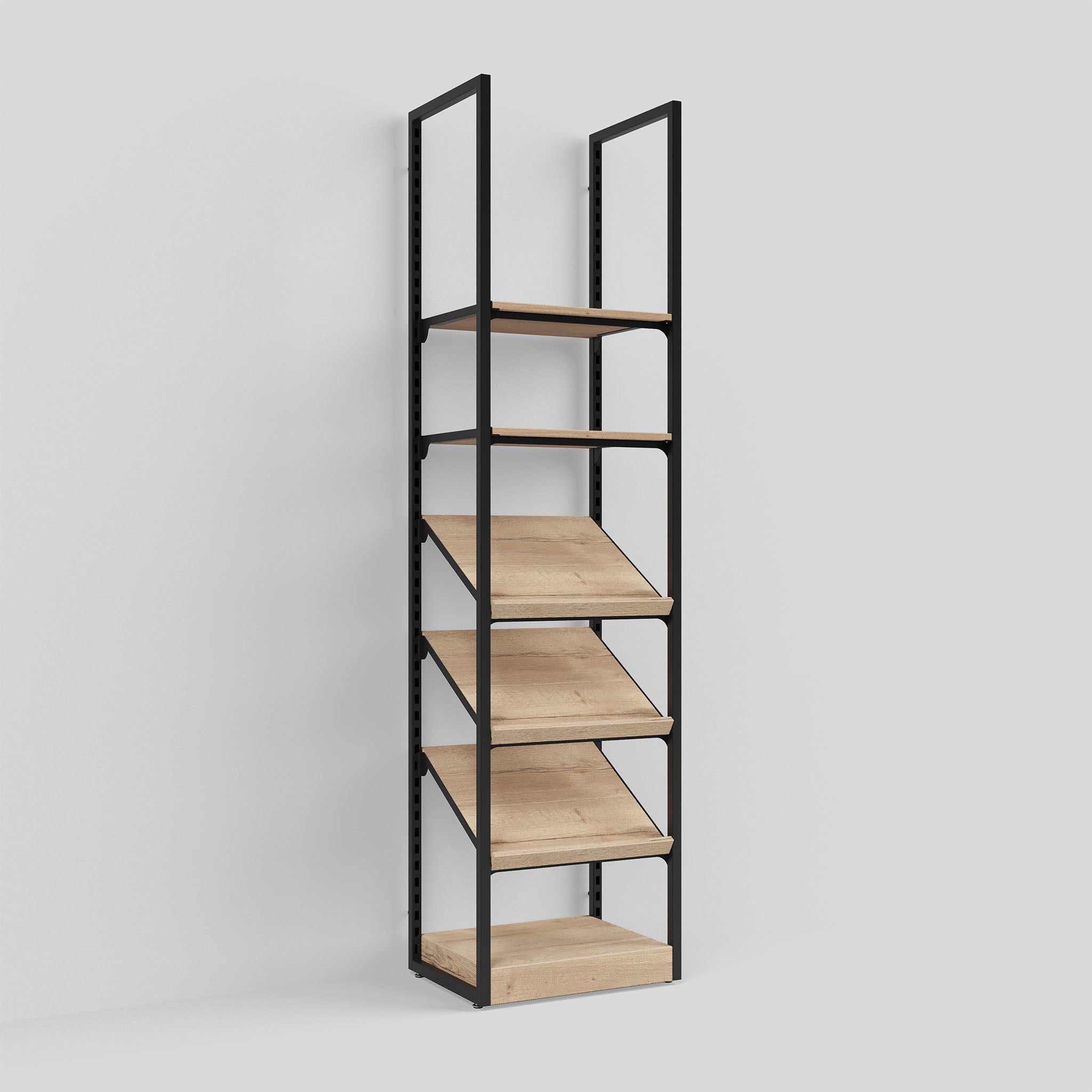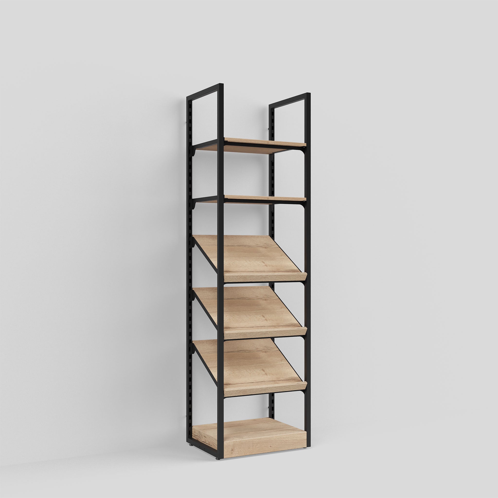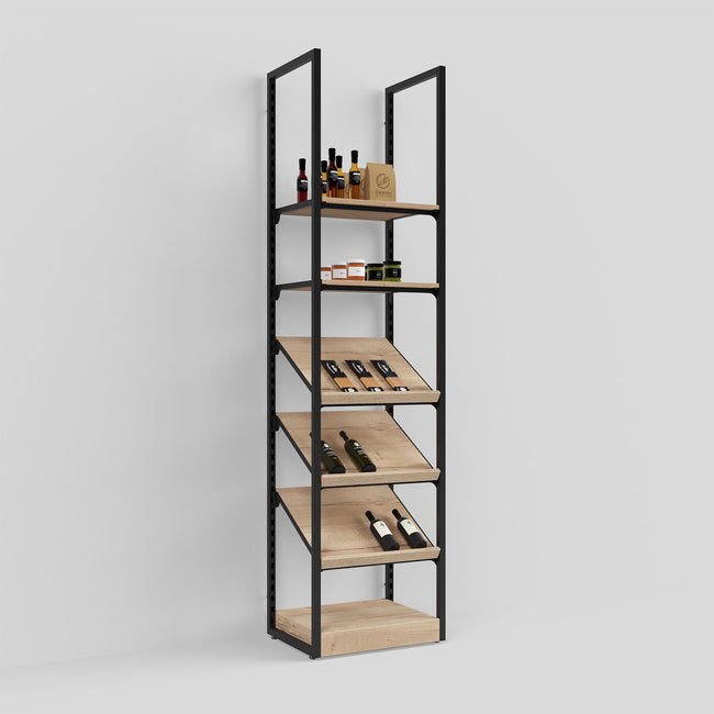 Transforming traditional shop shelving, Addison Fine Foods Style 1 is a narrow unit suitable for smaller display areas. Available in two heights, it comes with angled and horizontal shelves and a pedestal.