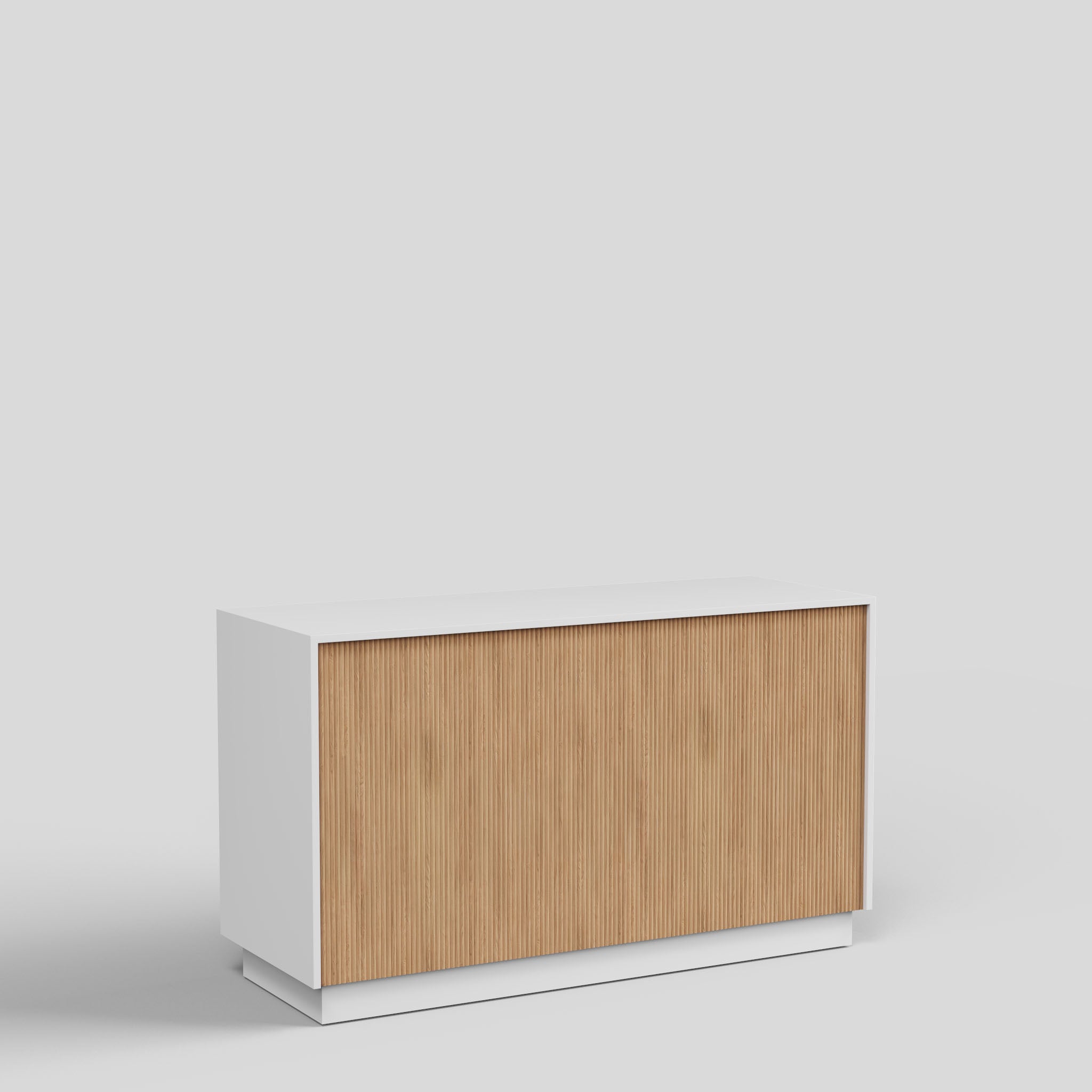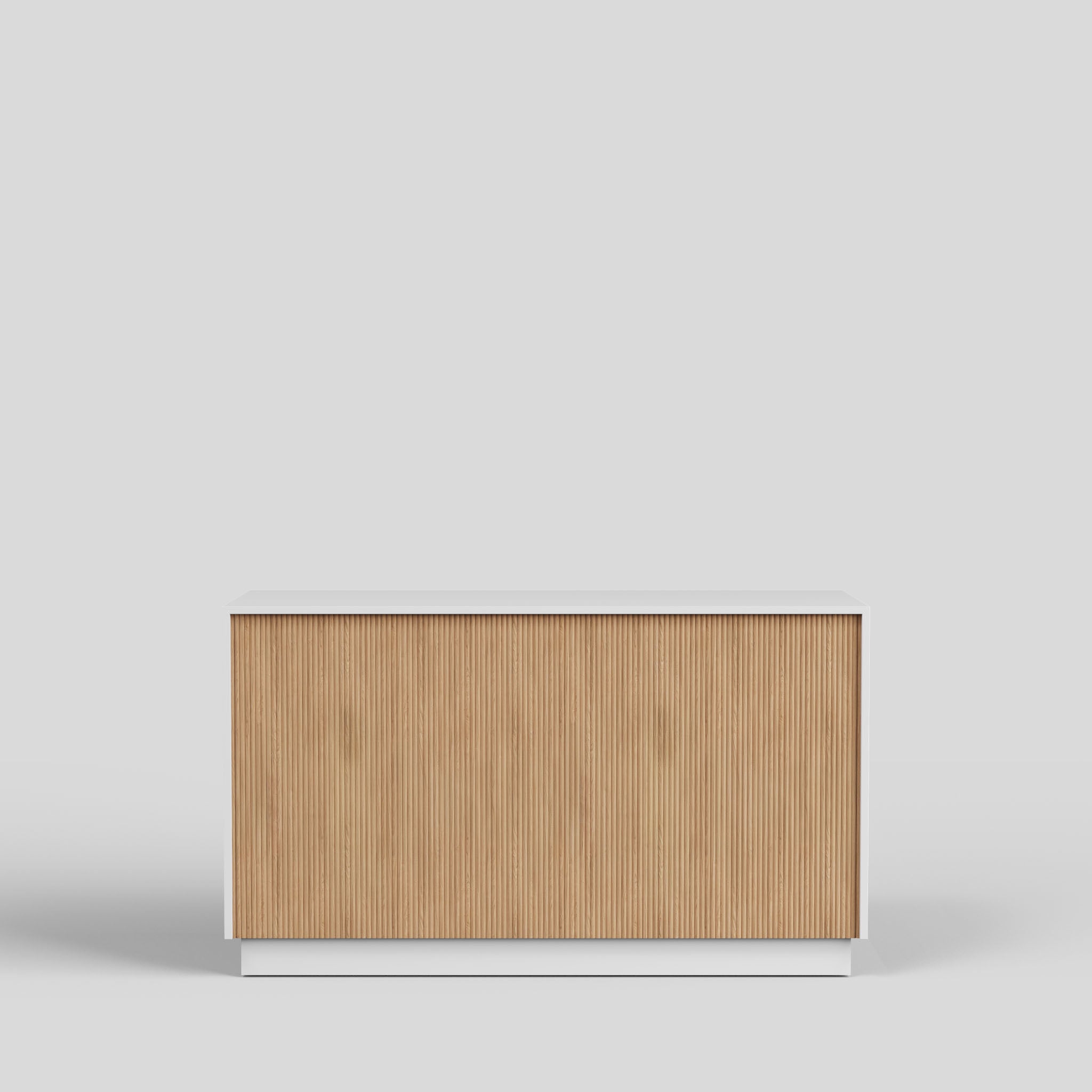 The Malé retail counter brings the inviting warmth of solid wood into your store interior. The distinctive European oak front with its profiled surface is a standout detail that gives the counter a timeless character. White side panels and a matching base and top create a modern contrast and showcase the natural wood structure to full effect.