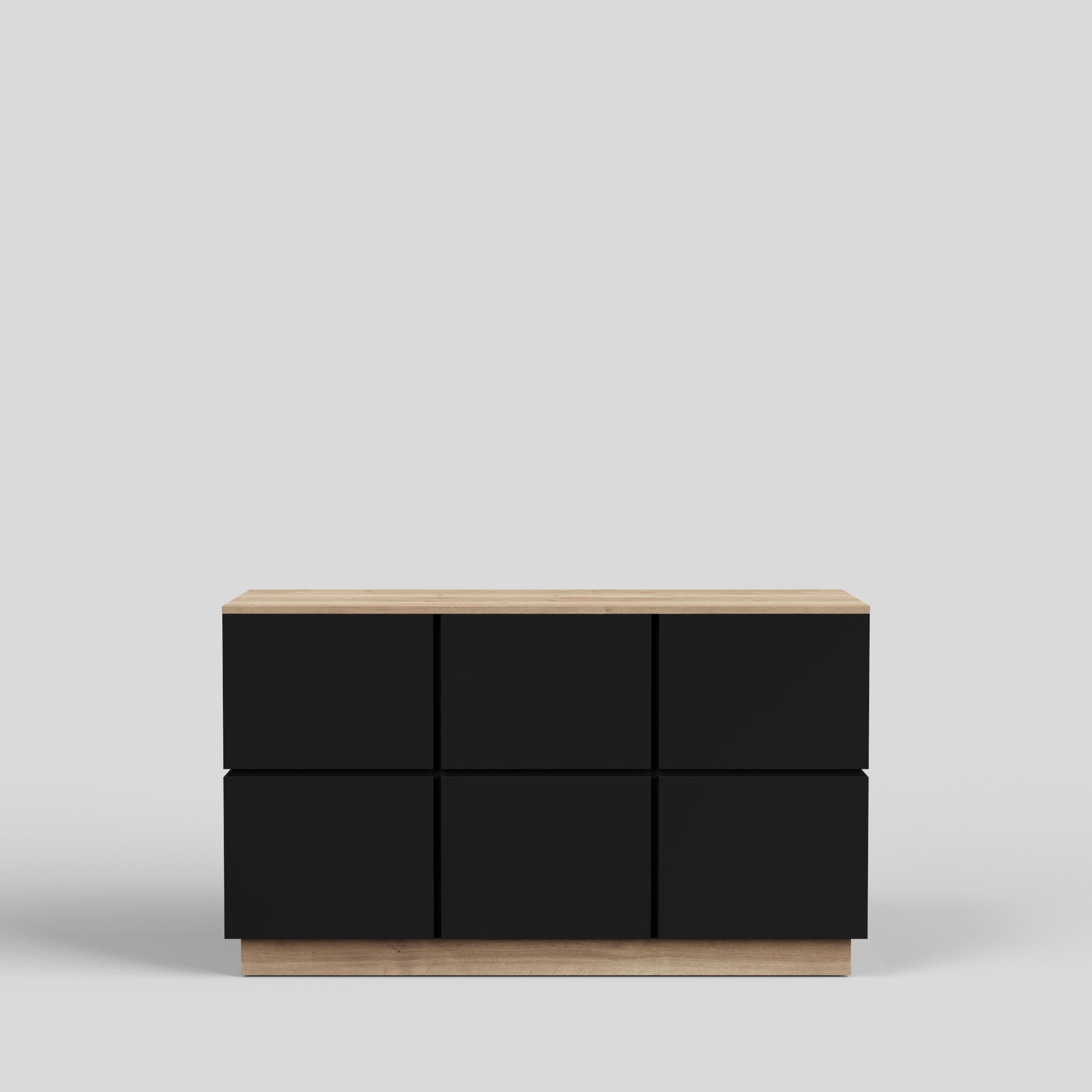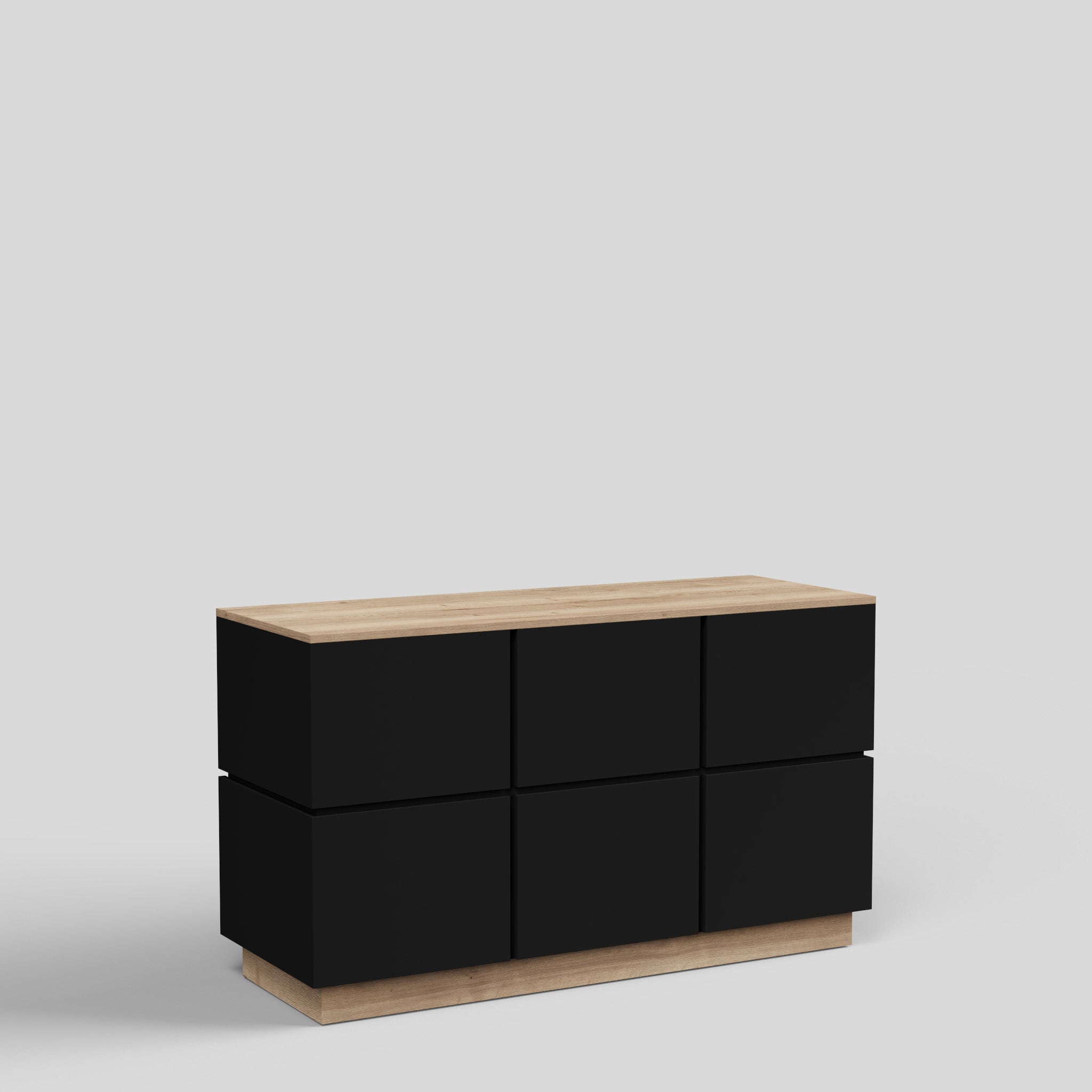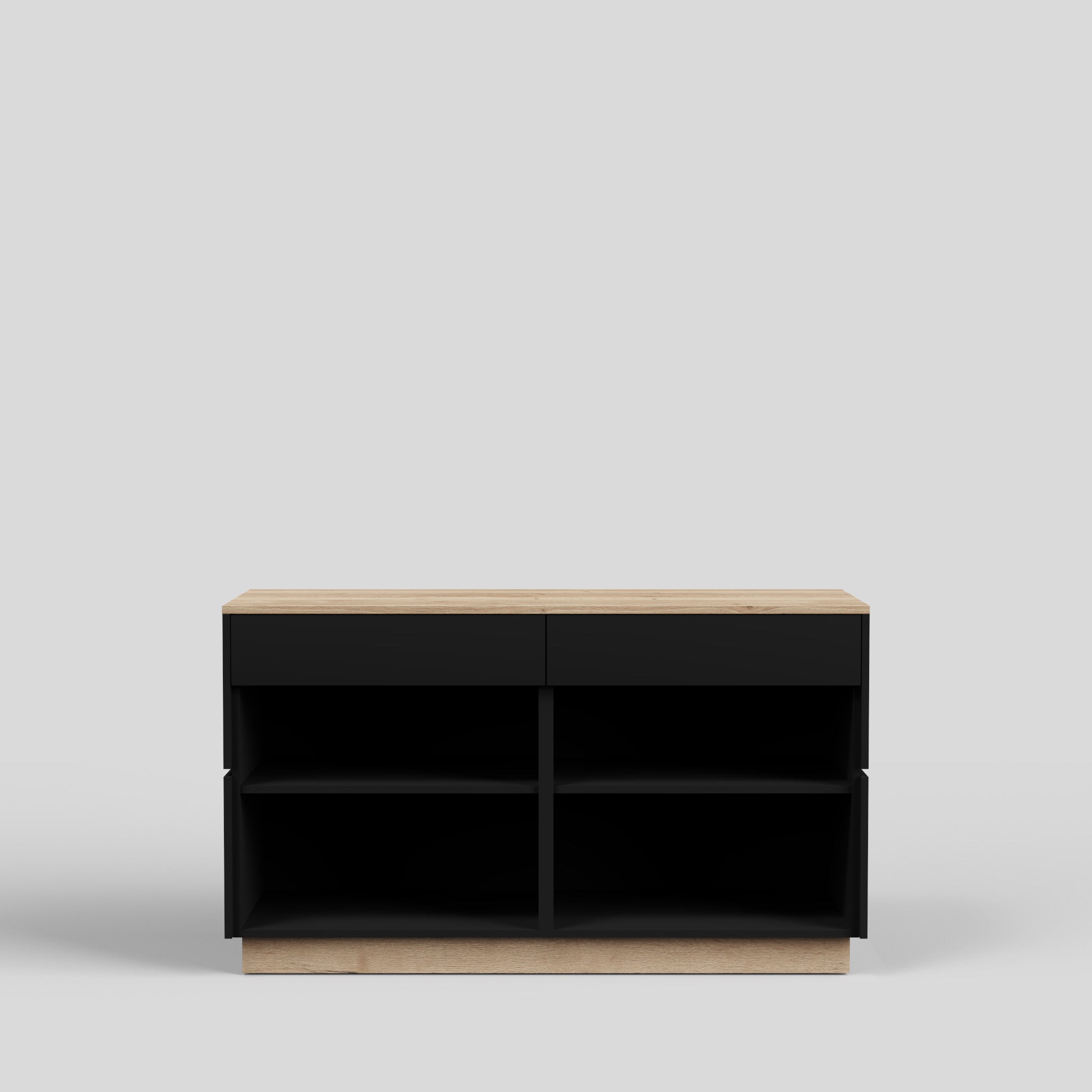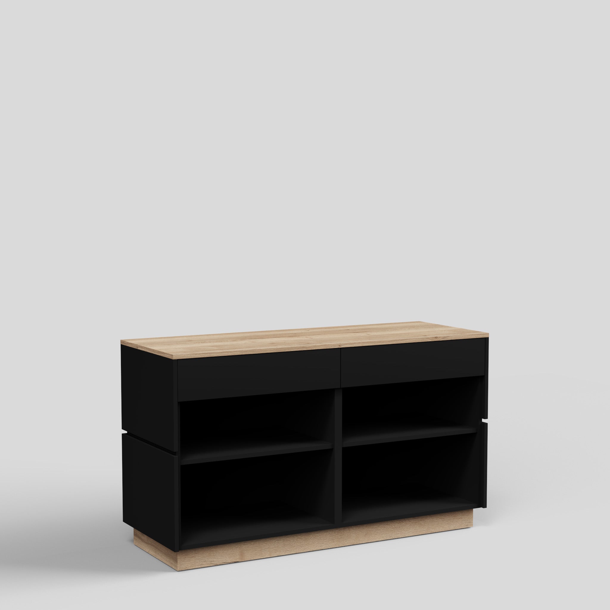 The Tokyo shop desk combines timeless design with a modern character. Clean lines and an expressive anthracite-grey finish give your retail space a high-quality appearance. Thanks to its stylish look, the counter can be easily combined with other store fixtures – for example with our cube tables in matching anthracite or with pedestals in wood decor, which harmonize perfectly with the top and base in Natural Halifax Oak. The result is a harmonious look that elegantly combines functionality and aesthetics. Equipped with two drawers and two height-adjustable shelves, the Tokyo retail counter offers practical storage and can be used flexibly – such as a reception desk.